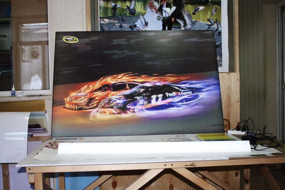 - Тонком пластике. Он прочный, с высокой цветопередачей. Изображение получаются очень яркими, насыщенными. Также устанавливается в коробах с подсветкой.