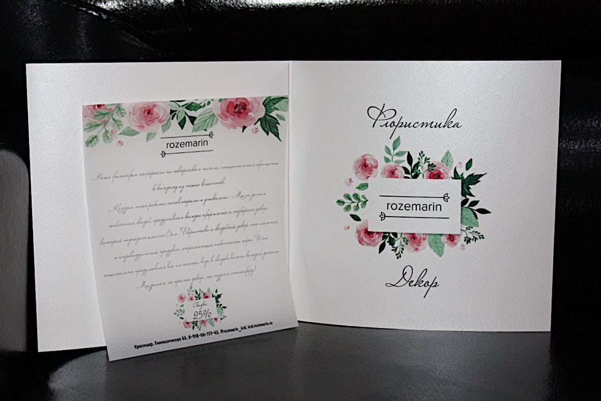 Важное преимущество этого рекламного средства: широкое поле для дизайнерской мысли. Изображения и текст размещаются с обеих сторон листа, поэтому места для экспериментов достаточно. Буклеты и лифлеты органично дополнят рекламную кампанию, расскажут клиентам о ваших услугах и акциях, подчеркнут индивидуальность и корпоративный стиль.