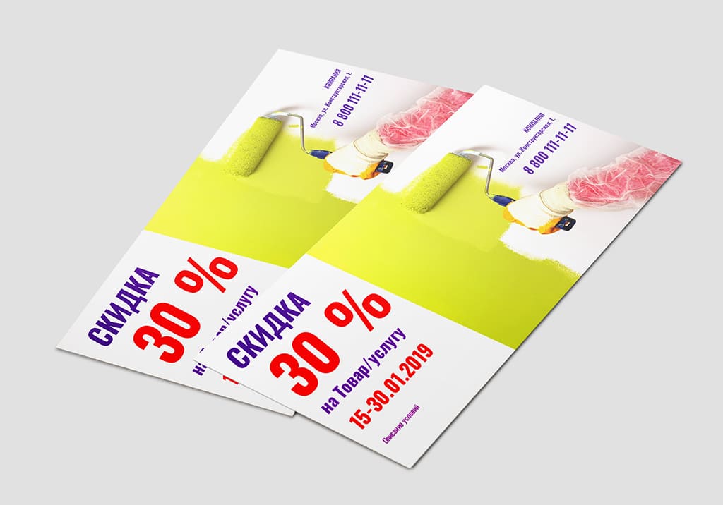 Выбор материалов зависит от пожеланий и целей. Для обычных информационных флаеров используют тонкую бумагу. Если купон необходимо сохранить (например, скидка предоставляется при предъявлении), рекомендуем более плотный материал, чтобы продлить жизнь изделия.